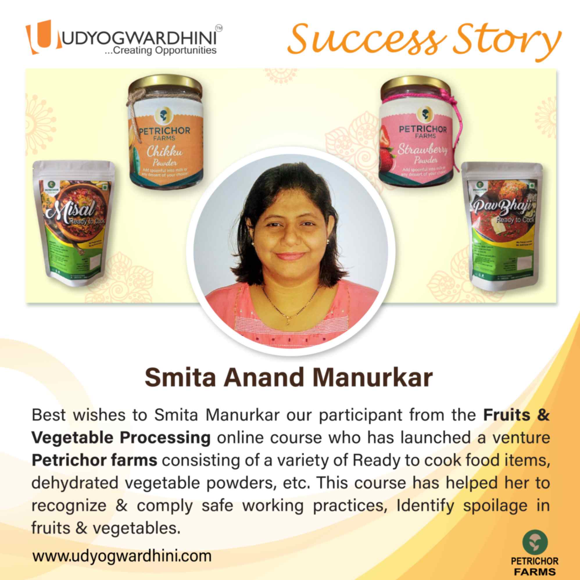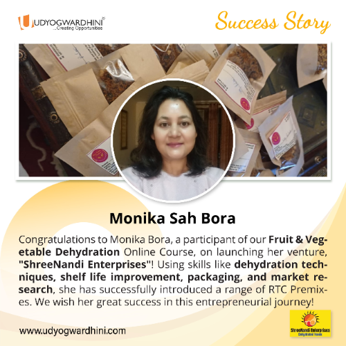 Monika Sah Bora is a participant in our Fruit & Vegetable Dehydration Online Course and has launched her venture, "Shree Nandi Enterprises," in Gurgaon, Delhi. Utilizing her skills in dehydration techniques, shelf life improvement, packaging, and market research, she has successfully started her business, offering a range of Ready-to-Cook (RTC) premixes. We wish her great success on this entrepreneurial journey!