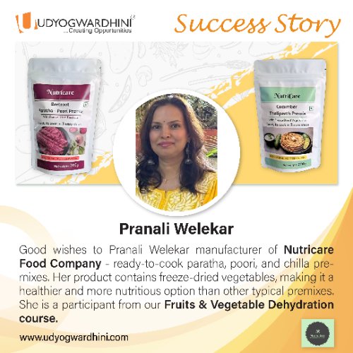 Mrs.Pranali Welekar, Participant from our Fruits & Vegetable Dehydration course. She Launched, RTC Products brand ‘Nutricare Food Company’ - under this category she launched products like Ready-to-cook paratha, poori, and chilla pre-mixes.