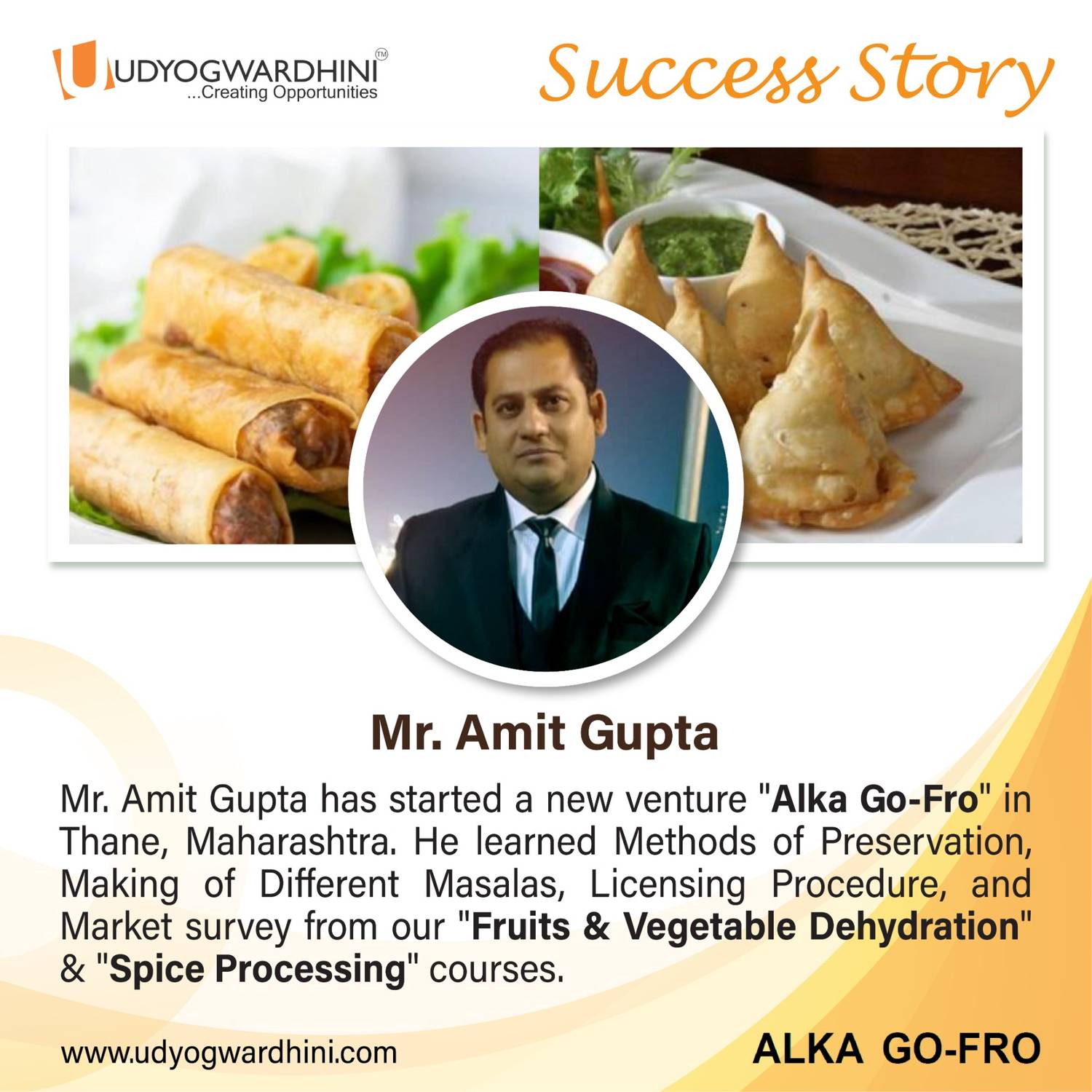Mr.Amit Gupta has attended our Fruits & Vegetable dehydration course. He owns a Restaurant & wanted to bring innovation to the menu and reduce the time to serve orders. After exploring different applications of dehydration, he developed own recipes in the Frozen food category & launched a range of frozen snacks under his Brand 'Alka Go-Fro'.