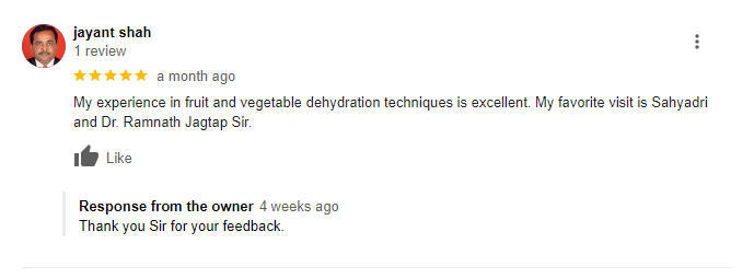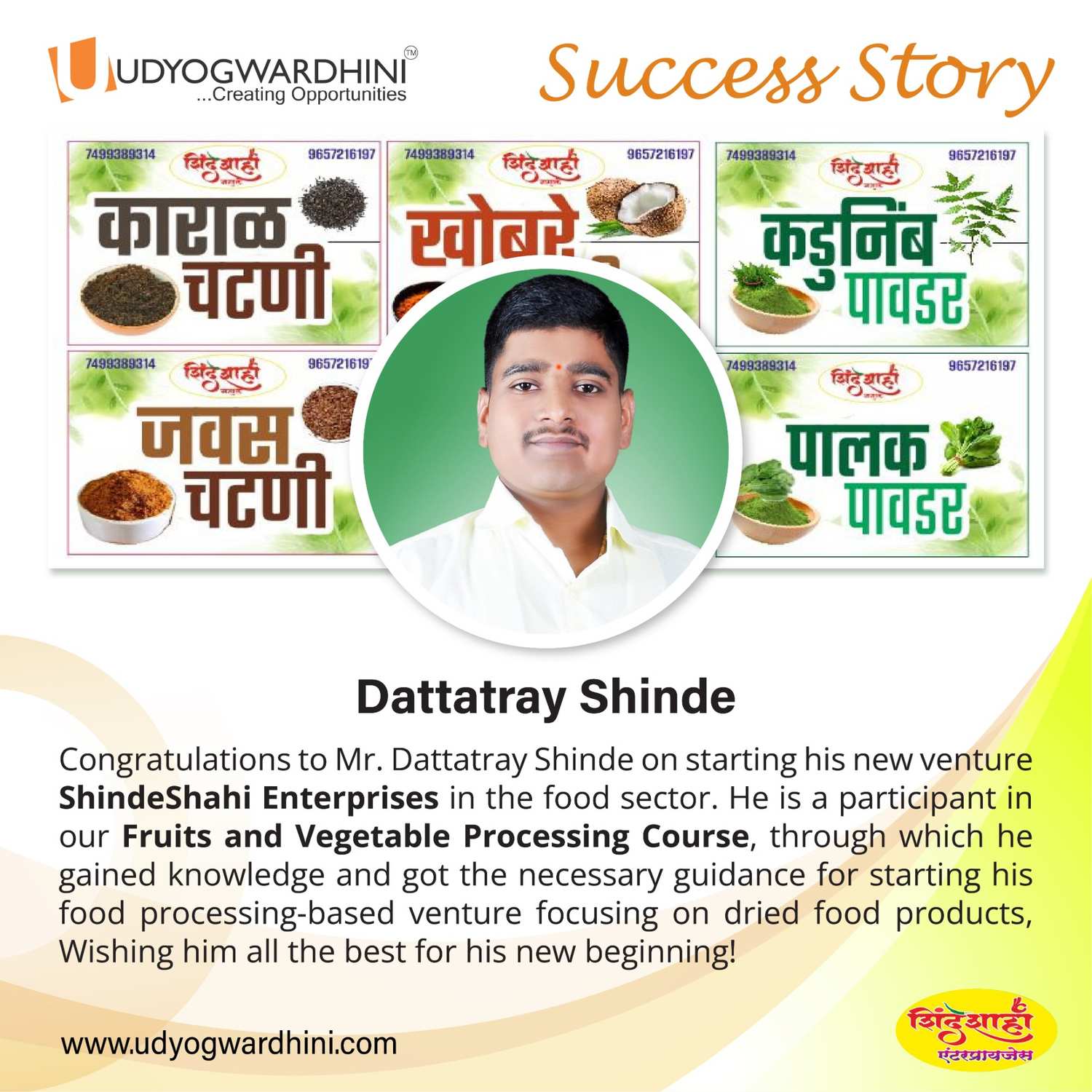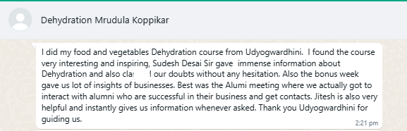 Mr.Dattatray Shinde attended our Fruits & Vegetable dehydration course, after training he started his Dehydration & Spice Processing Unit. His product portfolio includes various types of Powdered dehydrated products, chutneys & spice blends.