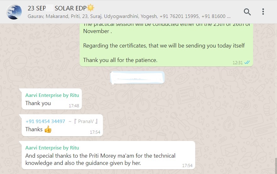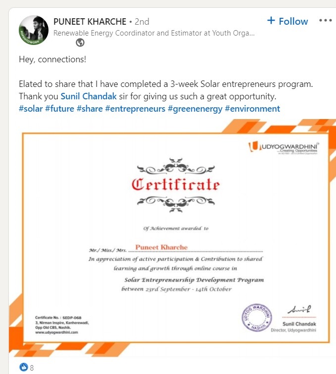 A) We will provide a access to community of entrepreneurs of solar sector & also our mentors will guide you after training also.